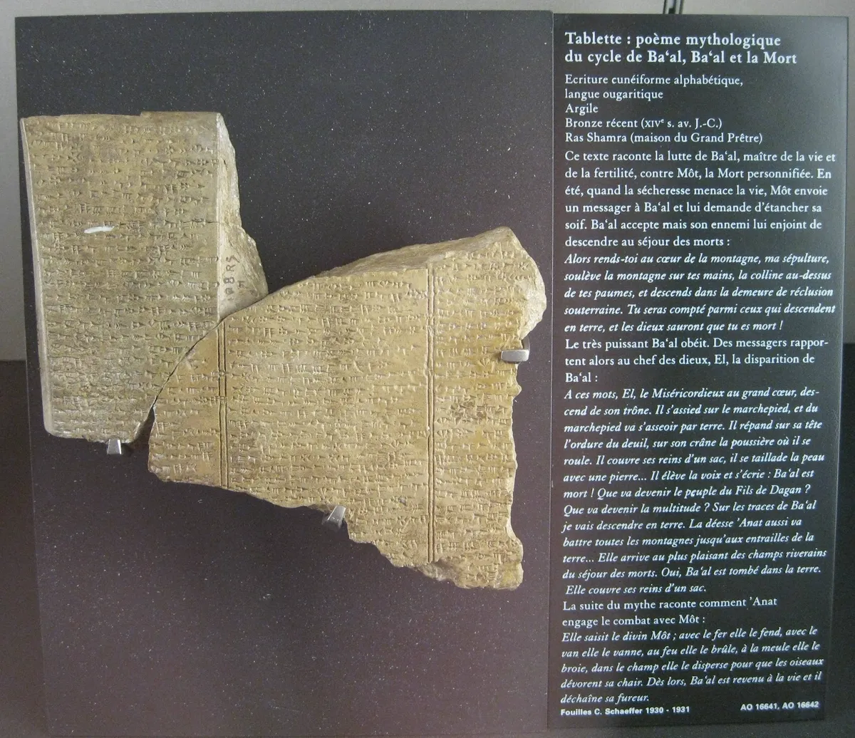 上图:在叙利亚Ras Shamra发现的主前14-12世纪乌加里特文本(Ugaritic Text)迦南史诗巴力合集(Baal Cycle),揭示了古代迦南的巴力崇拜,其中提到巴力与母牛淫合并生子。