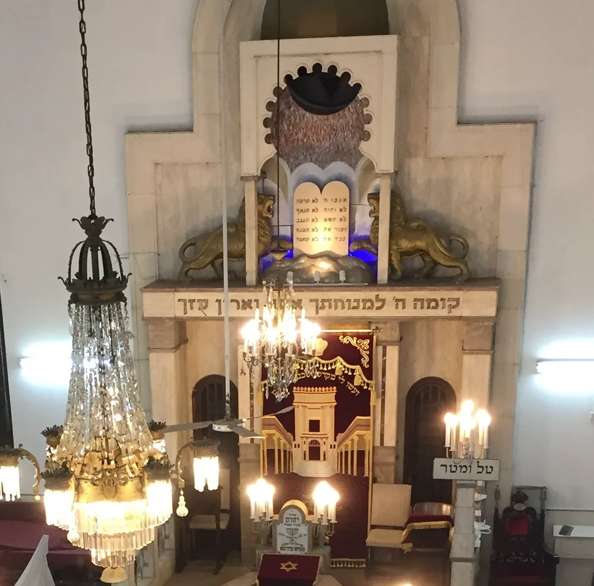 上图:特拉维夫国际犹太会堂,正中间是两块法版,两边是犹大的狮子,下面是第二圣殿和金灯台。