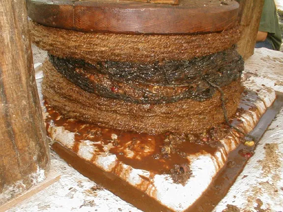 上图:古代以色列人制作普通橄榄油的压榨过程,流出的橄榄油很混浊。金灯台所使用的清橄榄油不能这样制作,必须用手工捣出来。