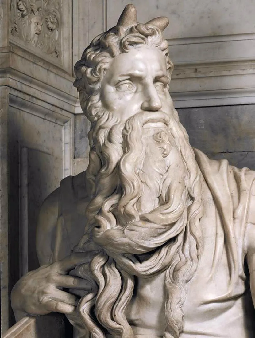 上图:米开朗基罗(Michelangelo)于1516年在梵蒂冈圣彼得锁链教堂(San Pietro in Vincoli)雕刻的大理石摩西像,头上长着两个角。艺术史学者Ruth Mellinkoff在《中世纪艺术与思想中的长角摩西(The Horned Moses in Medieval Art and Thought)》一书中对这一现象有深入研究。