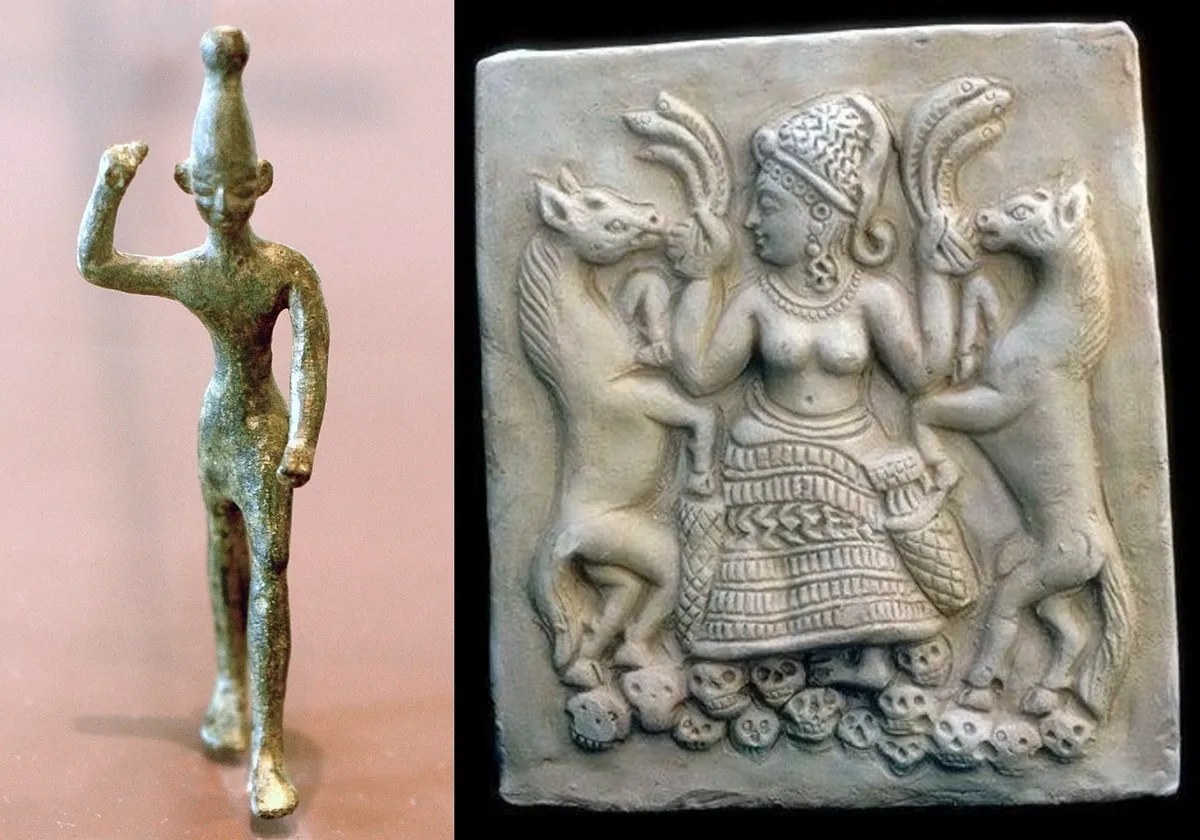上图:巴力和亚纳特。在迦南的宗教中,巴力(Baal)是雨水与农作物的神,每年的雨季就是巴力战胜大水与海洋带来的雨水,旱季就是巴力被死亡与干旱之神摩特(Mot)杀害。而巴力的配偶亚纳特(Anath)把摩特打败之后,巴力又复活,重新带给大地雨水。迦南人认为秋季的雨量与春季的作物发芽,都是因为巴力与其配偶交合所带来的繁殖力量。因此,行淫成为巴力崇拜仪式中的重要一环,关系到牲畜的多产、农业的丰收,所以为了促进巴力与其配偶繁殖的力量,迦南人要与神庙中的庙妓行淫。