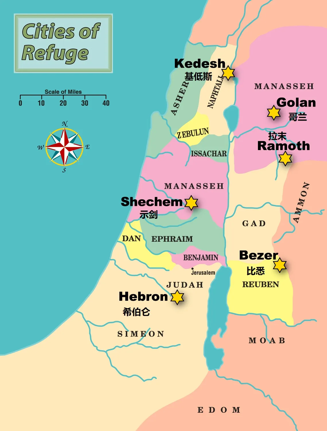 上图:六座逃城分布在十二支派之间,这样每一个地方的人都不会离附近的逃城太远。根据犹太传统,一般的大路只有16肘宽,但通往逃城的道路却有32肘,每个岔路都必须有明显的标识重复写上“逃城,逃城 מקלט מקלט”。