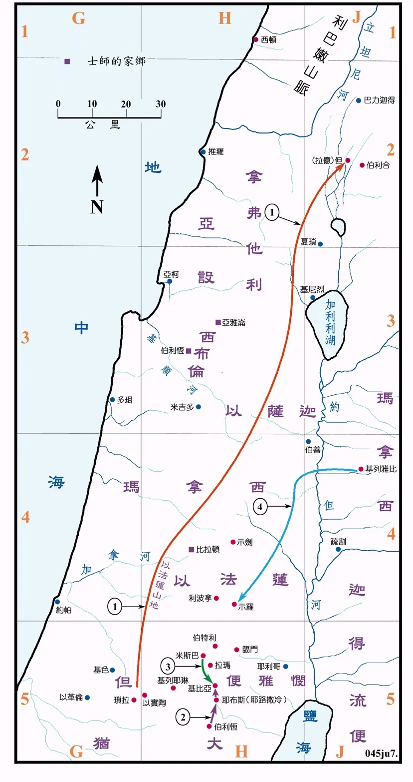 上图:但支派北迁、便雅悯支派险遭灭族:1、但支派攻取拉亿城,改名但城,在那里居住(士十八);2、一个利未人带着他的妾从伯利恒到了基比亚,在基比亚他的妾被辱致死(士十九1-28);3、以色列人集合在米斯巴,攻打基比亚,又烧杀了便雅悯的各城,便雅悯几被灭族(士十九29-二十48);4、以色列攻打基列·雅比,又将剩余的四百个处女带到示罗给便雅悯人为妻(士二十一9-12)。