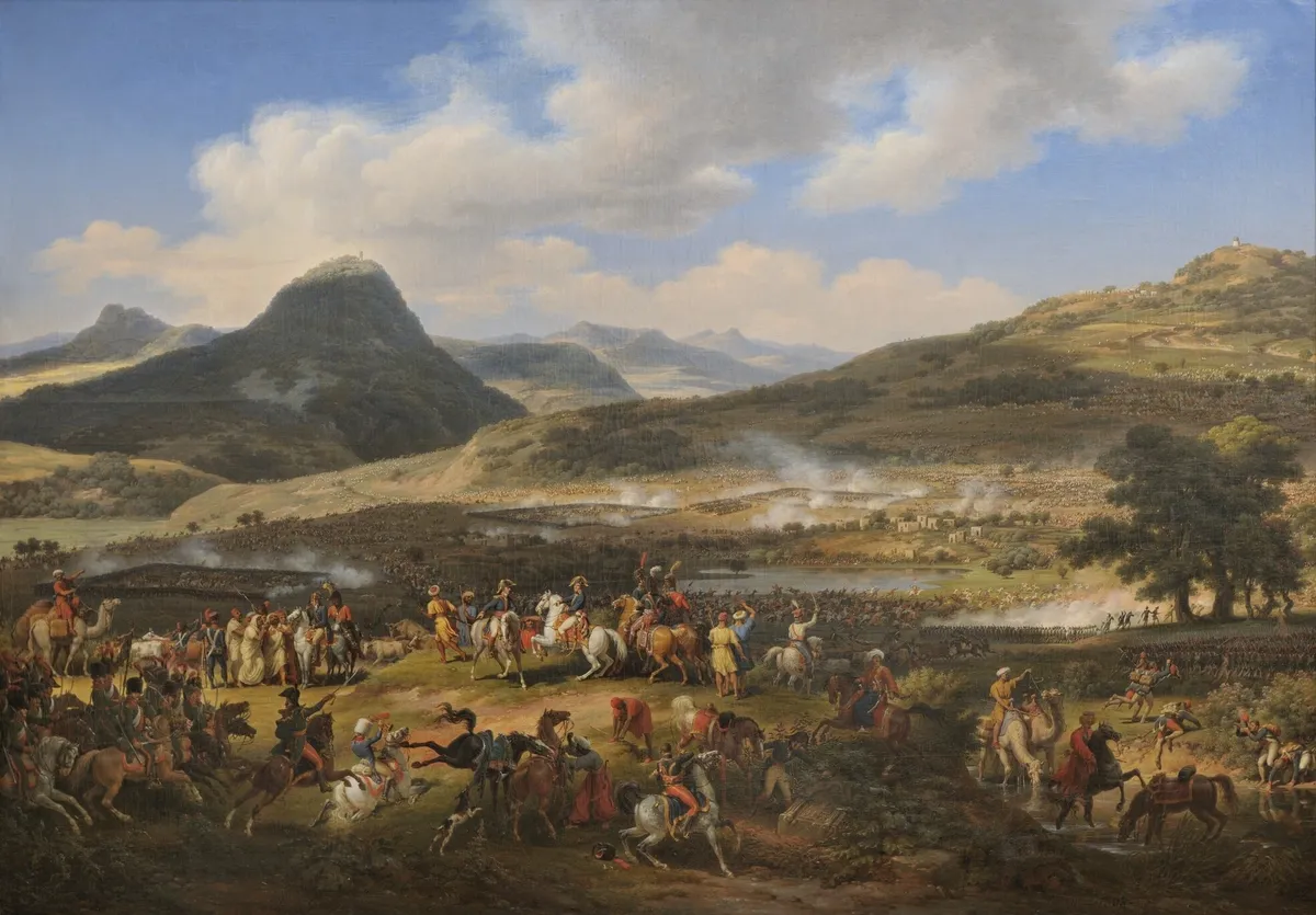 上图:描绘1799年4月16日拿破仑他泊山战役(Battle of Mount Tabor)的油画。拿破仑远征埃及时,4千法军在他泊山下的耶斯列平原阻击奥斯曼土耳其援军3万5千人,最终取胜。当时基顺河平原也泛滥,一些土耳其人在逃跑时淹死。