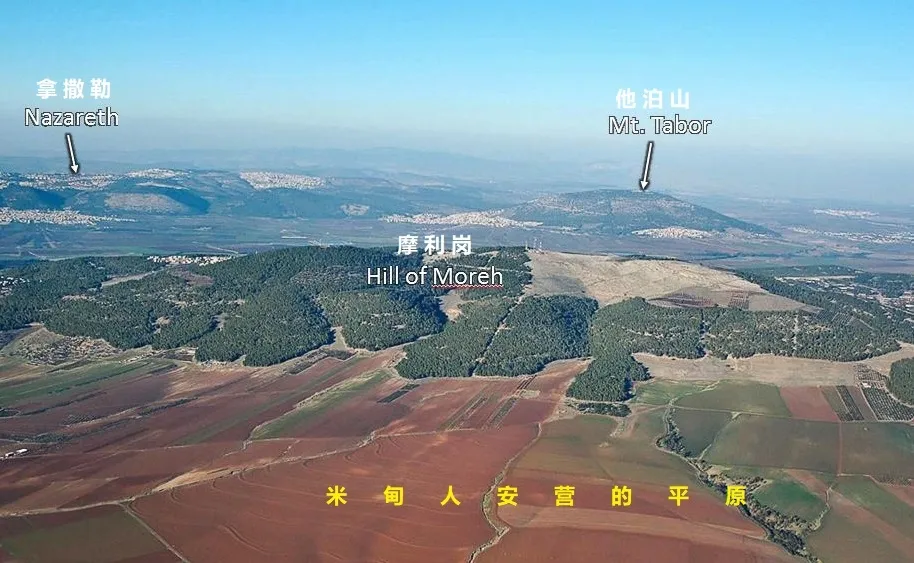 上图:摩利亚岗是耶斯列平原中间隆起的一片丘陵。米甸人就摩利岗南面的耶斯列平原上安营,他们「像蝗虫那样多,人和骆驼无数」(士六5)。