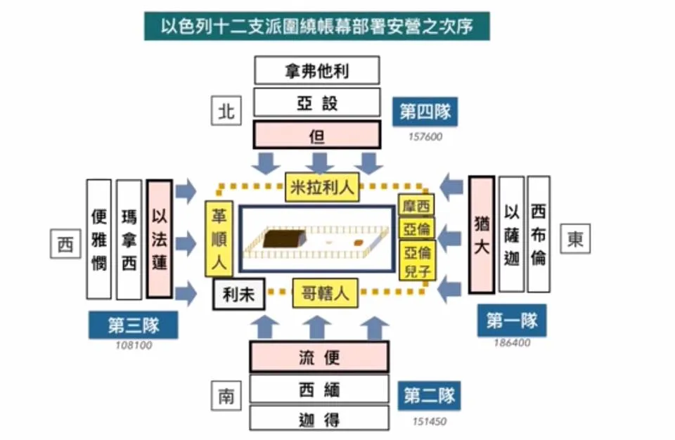 2:17 “会幕与利未营在诸营中间往前行。他们怎样安营就怎样往前行,各按本位,各归本旗。