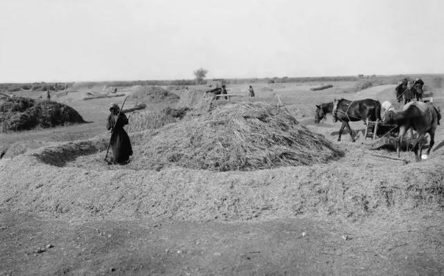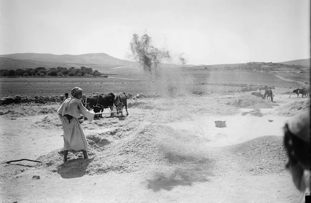 上图:19世纪末,巴勒斯坦的农夫在打谷场上扬场。农夫利用碌碡把麦粒和糠秕分开后,再用木叉把麦粒和脱离的糠秕一起扬在空中,风把比较轻的糠秕吹到远处,而比较重的麦粒则落在近处,这样可以把麦粒和糠秕分开。